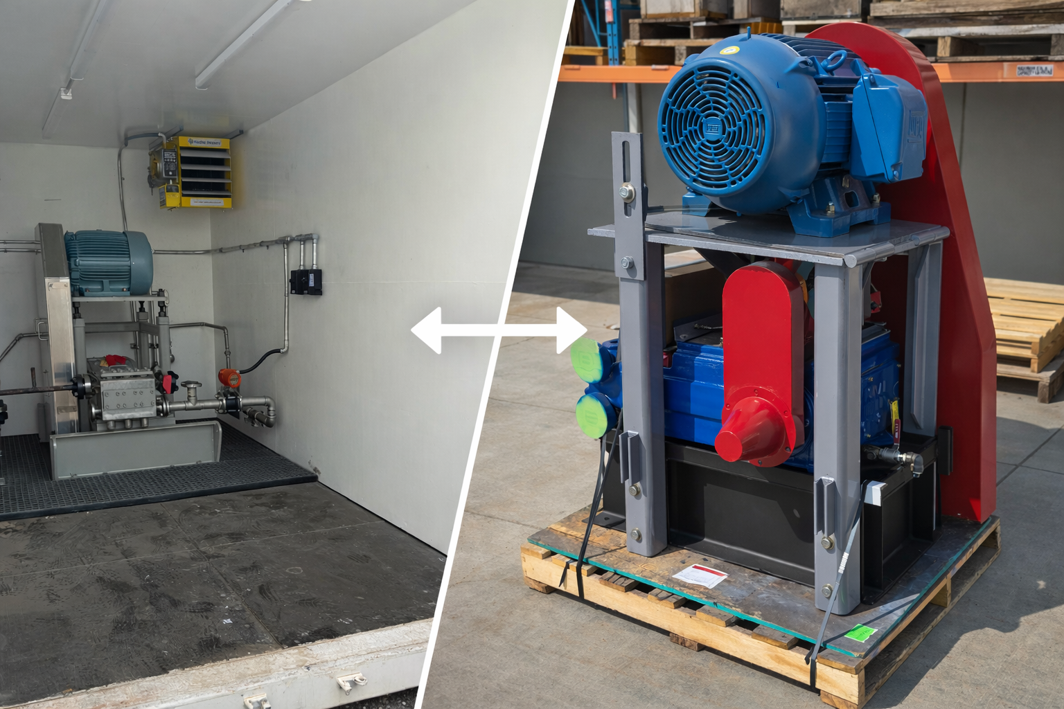 Our Remanufactured National 80T Triplex Unitized Mini-Skid Plunger Pump (CJV-2008) can be swapped into and installed within the Never-Used 60HP Kerr Triplex Pump with 40HP Motor Package (CJV-P135) containerized setup and customized to suit the application, while the Kerr package itself can also be removed and sold as a standalone pump.